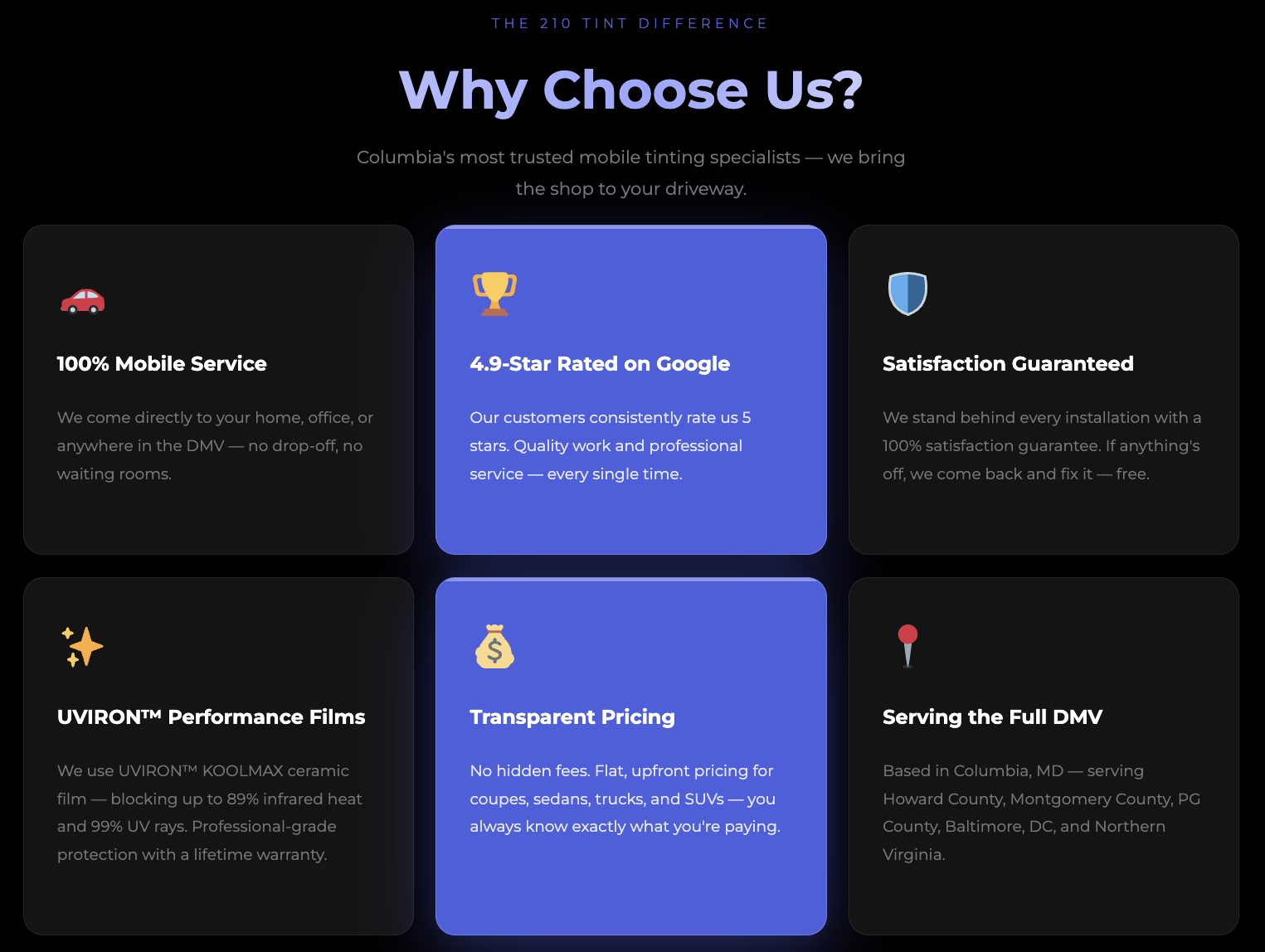 Renowned for delivering high-quality results, we specialize in auto window tinting and a variety of other services tailored to elevate your vehicle's appearance and functionality. Our professionals are skilled in custom window tinting, ensuring a precise match to your style while offering practical benefits such as heat-reducing tinting and UV protection. With options like ceramic window tinting, we blend innovation, durability, and sleek design. We are also excited to extend mobile tinting services to customers who have their own garages, offering you ultimate convenience without compromising the quality of our work. Our passion lies in enhancing your vehicle's comfort, protection, and aesthetic, combining both form and function seamlessly in every project we undertake. Trust us to provide top-notch service that exceeds your expectations and leaves you with a car that not only looks great but also feels great to drive. Get in touch with 210 Tint today.